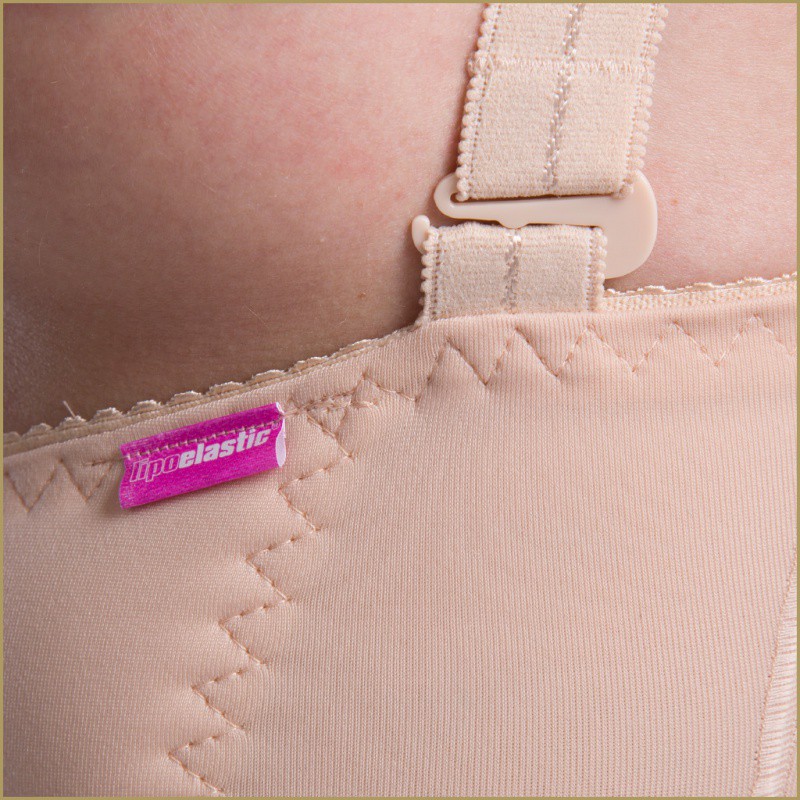 - The compression garment comes up to just below breasts with a narrow hem and buckles, where detachable and adjustable shoulder straps can be attached. These straps hold the garment in place and prevent slipping or rolling